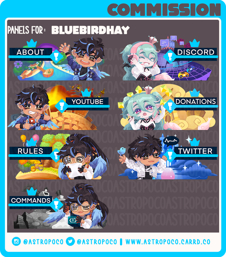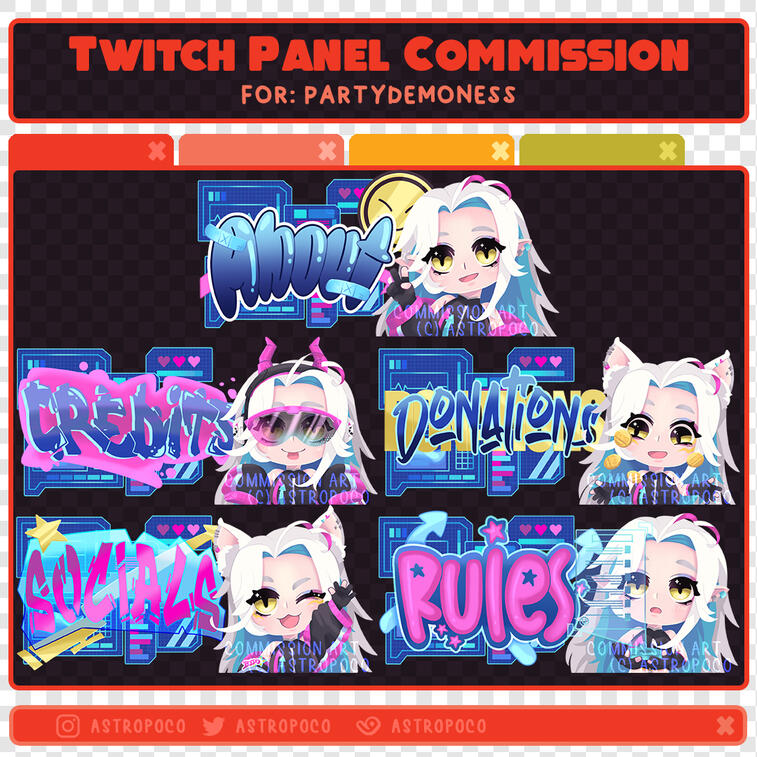 Panels will be sent out in the following dimension: 320px by 150px so they're ready for you to upload them to twitch! Full resolution available upon request.P R I C I N G :