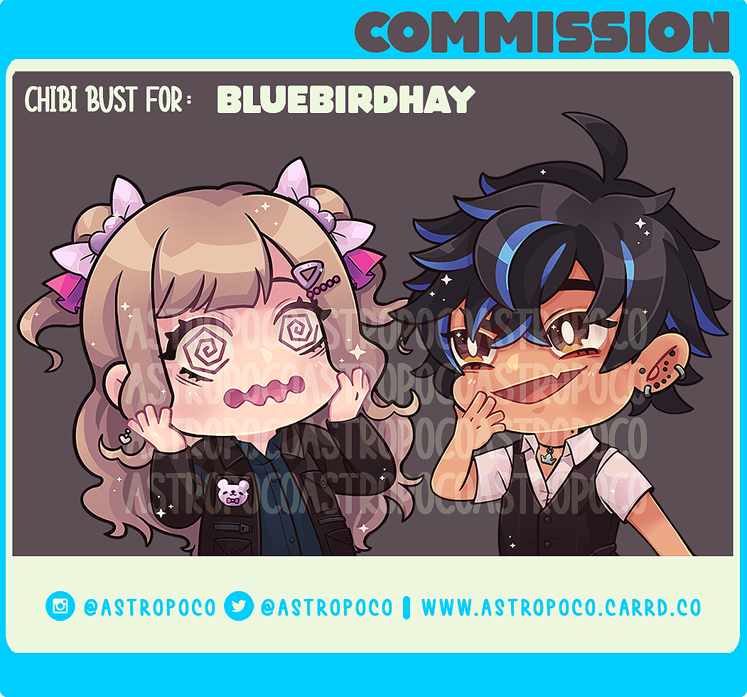 1. All commissions must be PAID IN FULL upfront before work begins.2. Payment only accepted through PAYPAL via paypal invoice to the email you provide.3. Commission work is NON-REFUNDABLE once started.4. Please email at [email protected] or DM me on twitter/instagram @ASTROPOCO with your commission request.5. I reserve the right to decline a commission request.6. Commissioned work is for PERSONAL USE ONLY.7. I, the artist, hold copyright to the produced artwork.8. You agree to the above terms and conditions when you send your commission request.